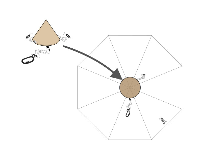 The 1Pole Cap is designed specifically for the RX Pyramid Tents and Ichi 1Pole Tents. This connector seamlessly unites the tent and tarp to create an extended living room. It’s meticulously crafted from reinforced polycotton fabric, embedded with PVC to adequately support substantial tarps, enhancing its durability and resilience. Comes with a rope and carabiner, enabling easy adjustments to suit varying situations.