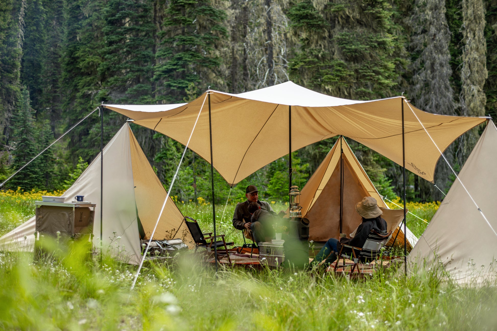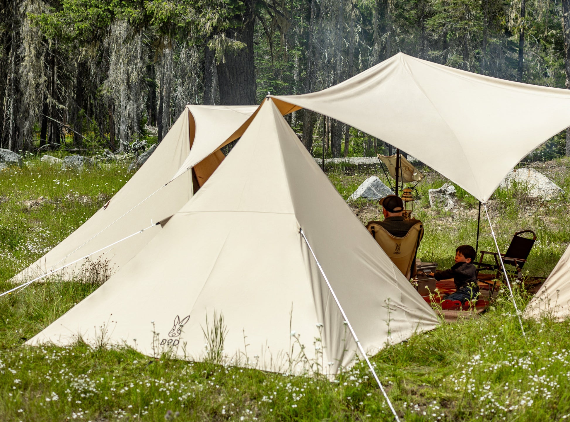 This architecturally stunning shelter redefines the three-room tent. Three Chimaki 2 person tents give private sleeping chambers for three couples or a big family. The three tents face onto a shared space, a covered courtyard, created by the Kama Tarp. Made of premium Canvo™. Poles and pegs included.