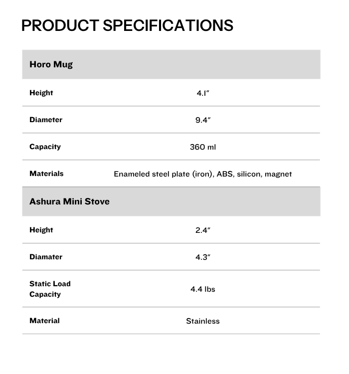 Cold coffee is a thing of the past with our combo Horo Mug and Ashura Mini Stove. Light up the Ashura, fill your Horo with your favorite hot beverage, and set the cup on the burner between sips. The Horo mug is made from enameled steel, so it can sit directly on an open flame. The Ashura stove is designed to perfectly support the Horo mug above the flame. When you’re finished, the Ashura packs down and nests perfectly inside the Horo. The Ashura stove burns paraffin - we recommend Coghlan's Fuel Stove Tablets as a fuel source.
