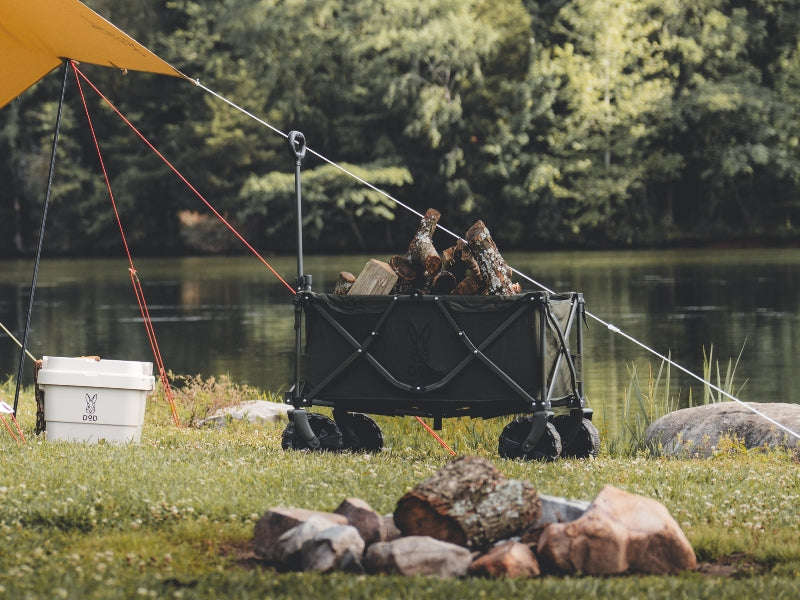 Get your gear from car to camp or camp to car easily with this rugged folding wagon. This is not your ordinary collapsing beach wagon. High gauge steel and a powder coat paint job make this collapsible wagon super rugged. It can handle heavy loads like firewood and the camp water supply. Extra large wheels help the wagon transverse soft or uneven ground.
